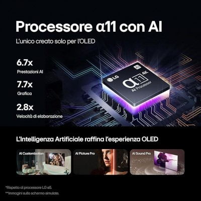 PROCESSORE α11: un processore potente creato da LG e specificamente progettato per l'OLED, per darti immagini e suoni raffinate dall'Intelligenza Artificiale
