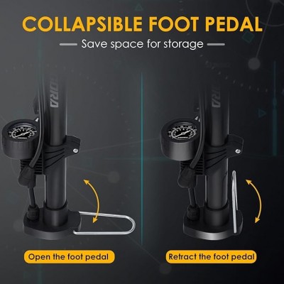 [Base pieghevole] - La base pieghevole fornisce più spazio di archiviazione per la pompa della bicicletta, non c'è bisogno di preoccuparsi della base lunga e larga che influisce sullo stoccaggio. VOGORA base pieghevole è realizzata in acciaio inossidabile spesso, robusto, durevole e molto stabile, non ha bisogno di preoccuparsi della sua durata.