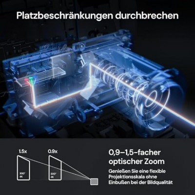 • Ottica di Precisione per Qualsiasi Spazio - Con il sistema di lenti OpticFlex (rapporto di proiezione 0,9-1,5) e funzioni di regolazione automatica come la messa a fuoco e la correzione trapezoidale, ottieni un'immagine impeccabile in qualsiasi stanza senza perdita di nitidezza, sia compatta che spaziosa. Puoi proiettare fino a 300" con facilità, offrendo una soluzione portatile e flessibile che garantisce dettagli straordinariamente nitidi, superando i limiti delle TV tradizionali.